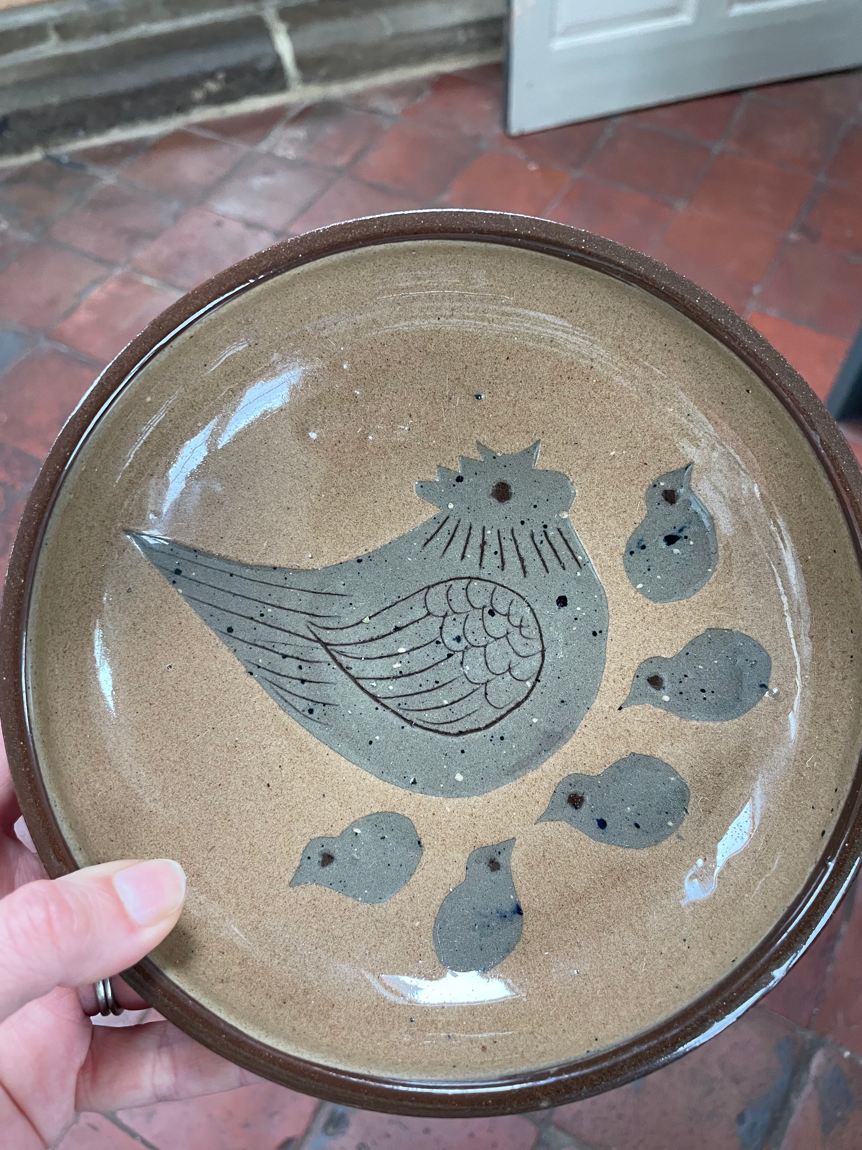 Hand thrown earthenware bowl with chicken and chicks by Elisabeth Bailey