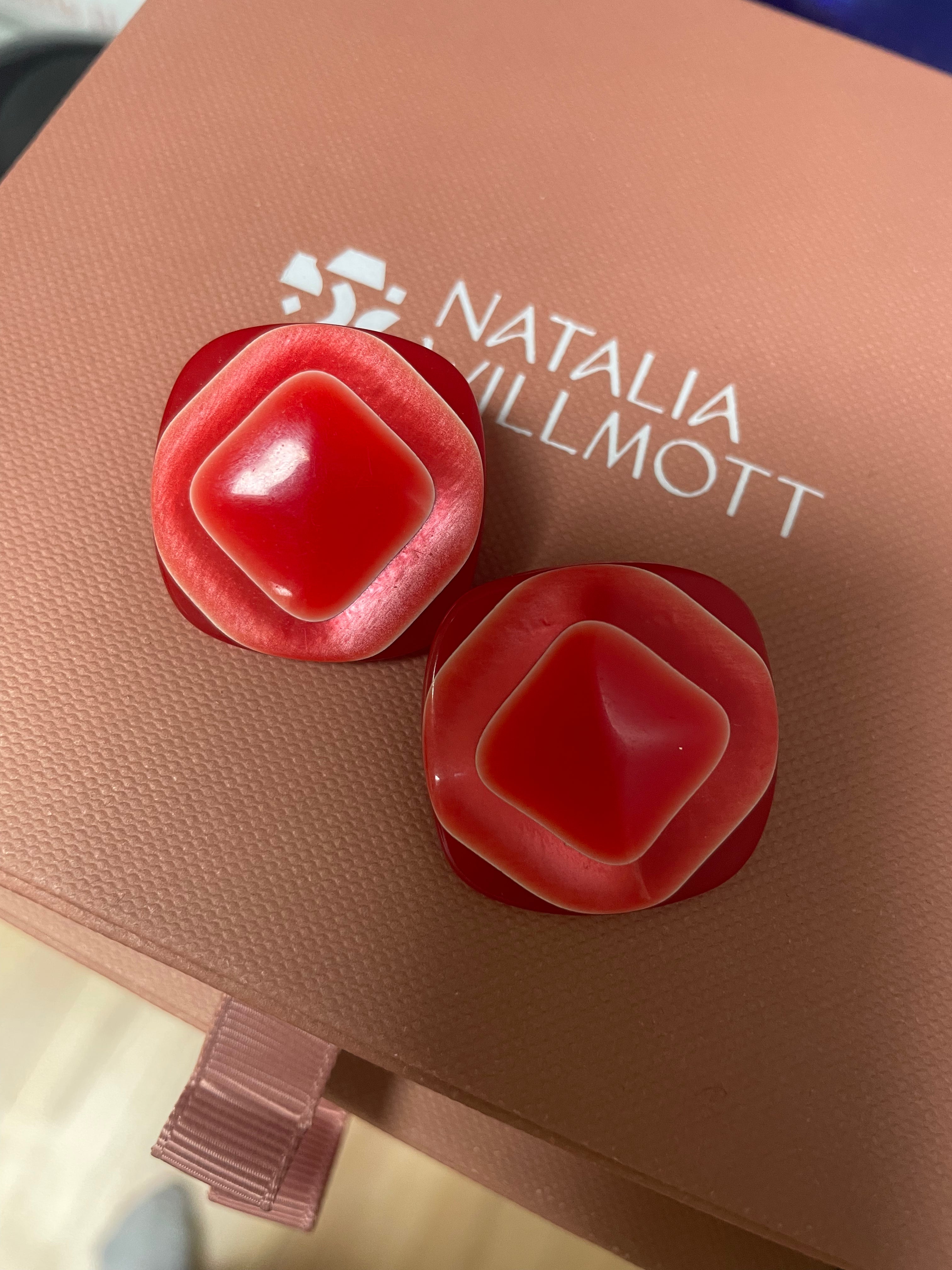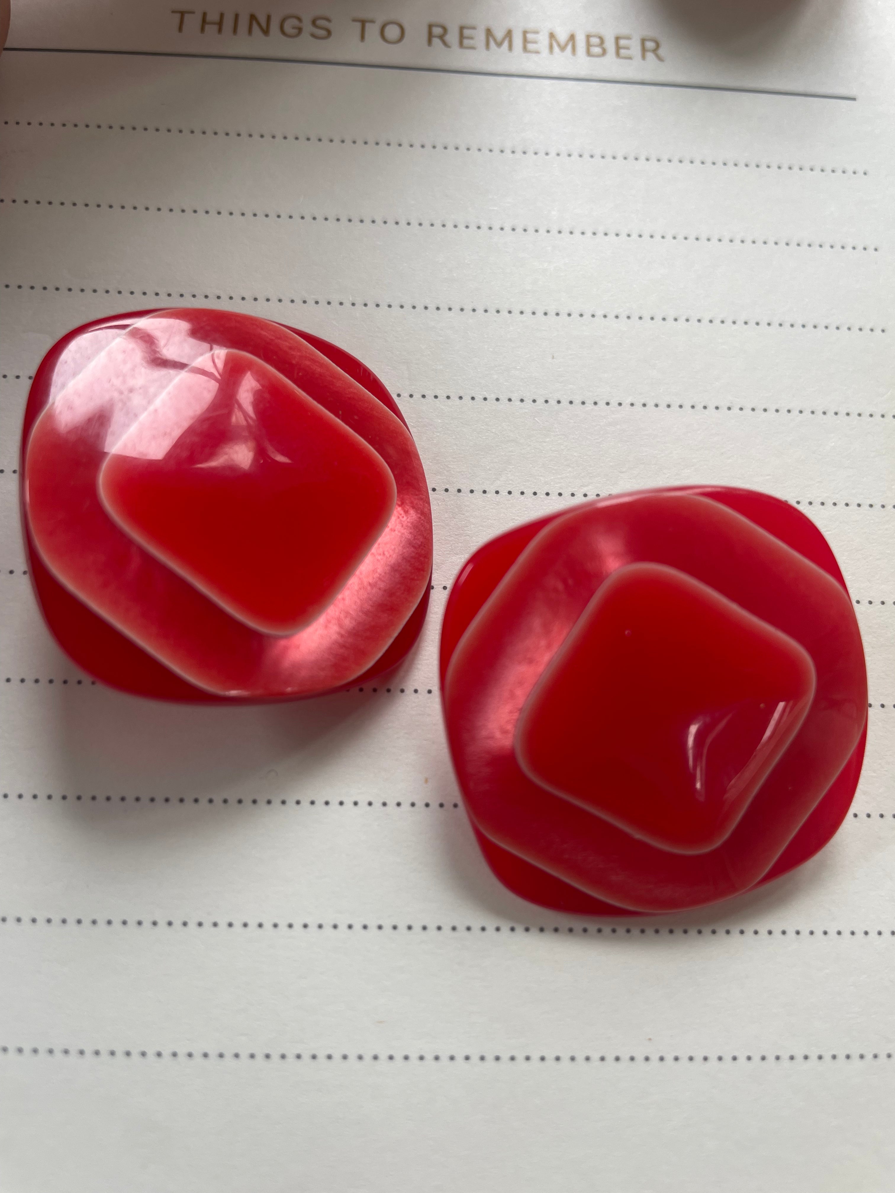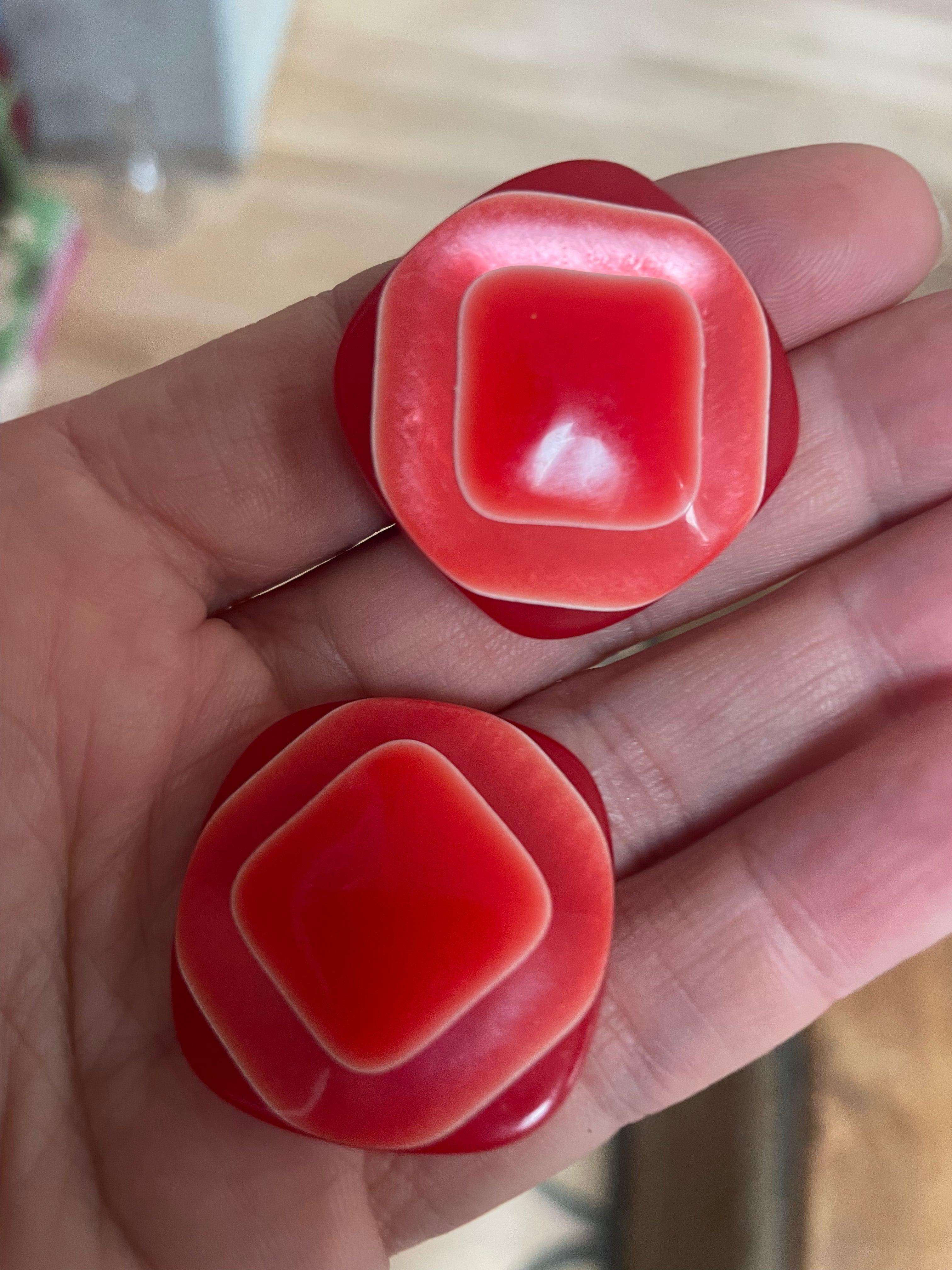 Clip on earrings from the 1960's in red and "moon glow pattern of squares in acetate.