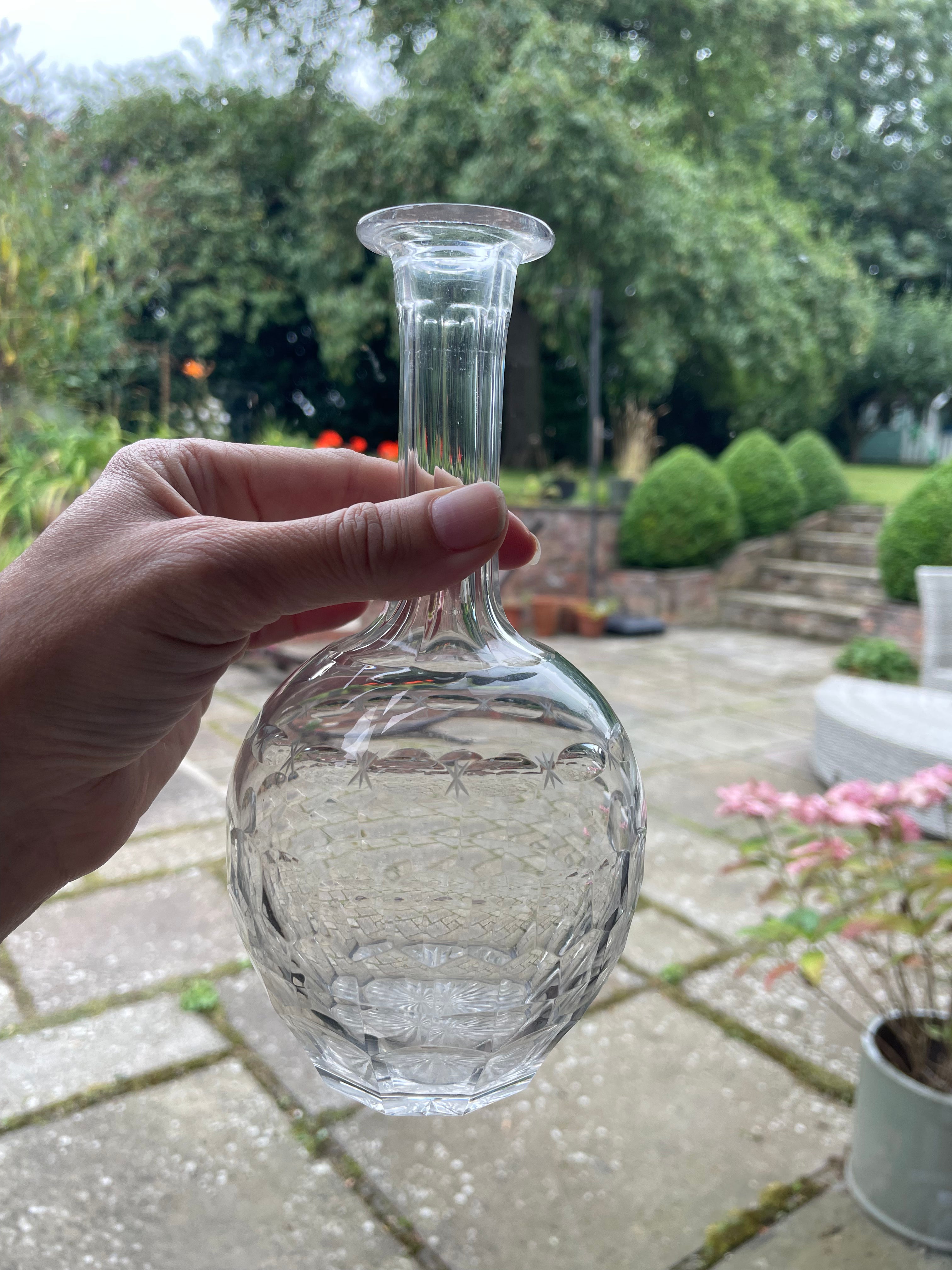 cut clear crystal long neckvase, with engraved star pattern. In the crystal surface of the center of the base, there is a starburst. Would make the perfect wedding gift.