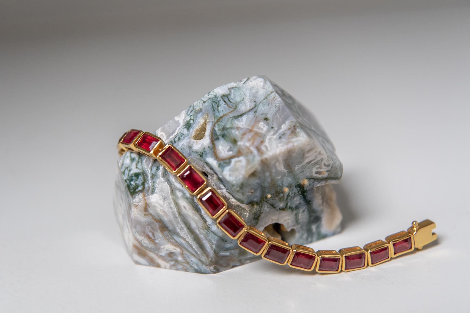 This exquisite bracelet features rubies set in gold vermeil over solid 925 sterling silver with a gold-plated finish. Crafted sustainably, it uses recycled silver and gold, with gemstones sourced from the mining industry's waste stream, reflecting a commitment to responsible luxury.