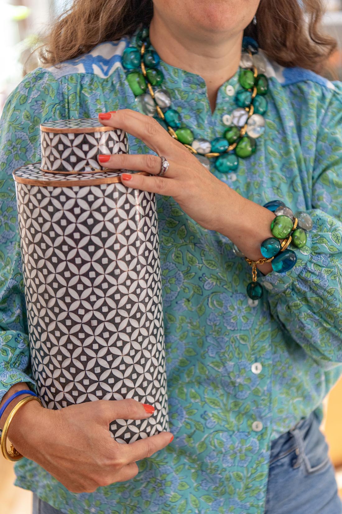 Cloisonné tea box tall eye black and white geometric by Fabienne Jouvin