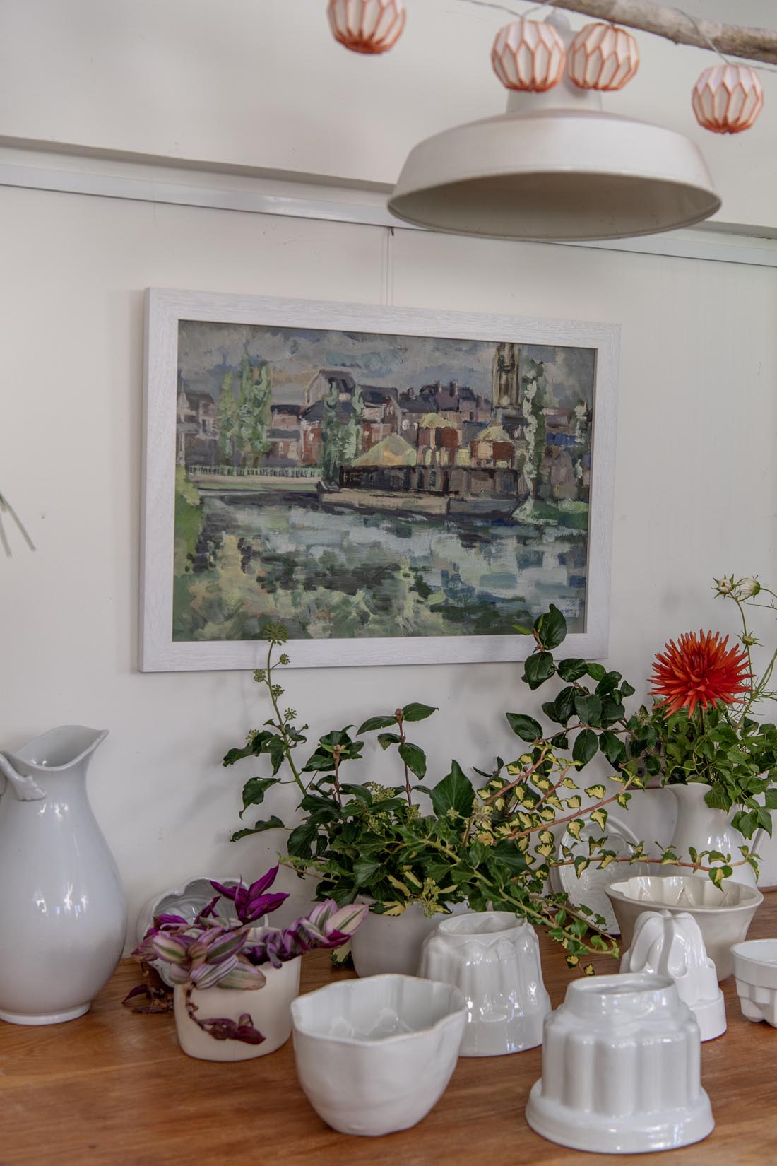 Beautiful rendition of a canal boat , surrounding nature and houses. The colours are muted and the boat and houses all blend into each other.