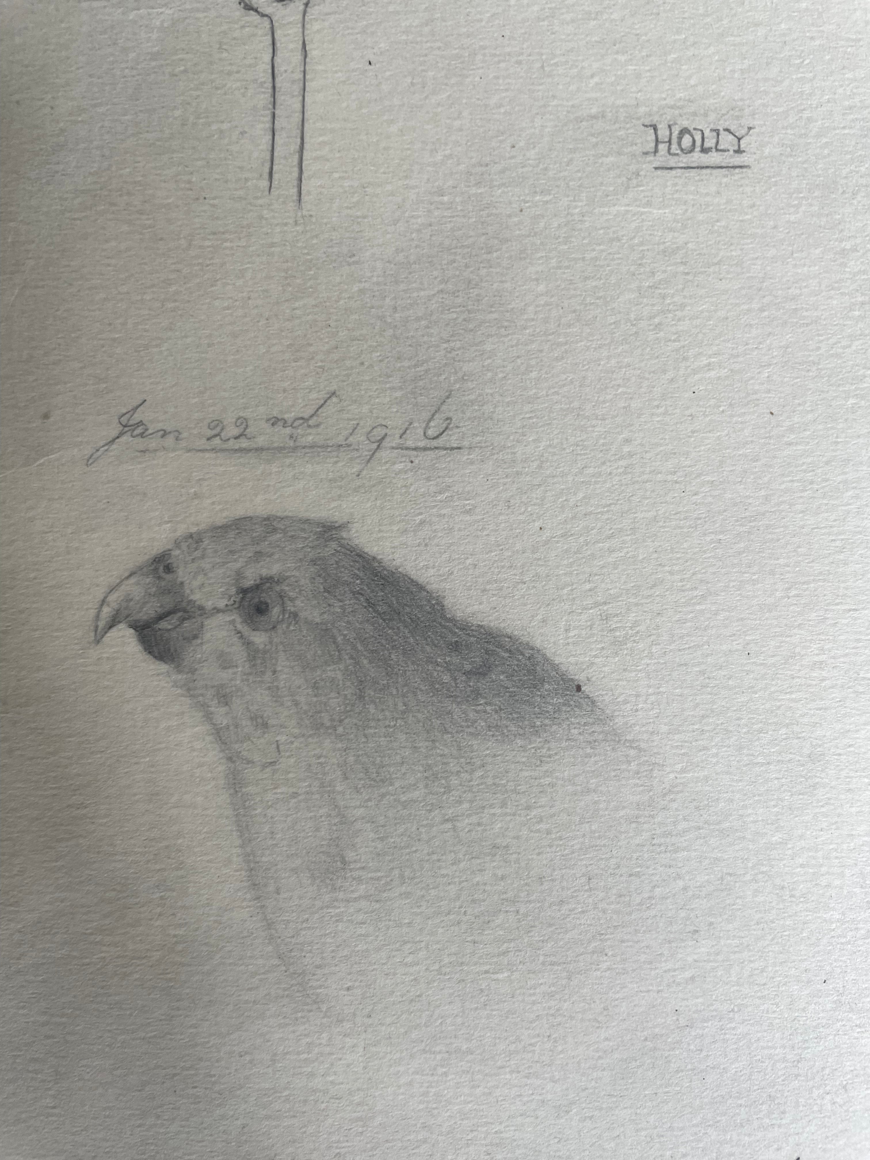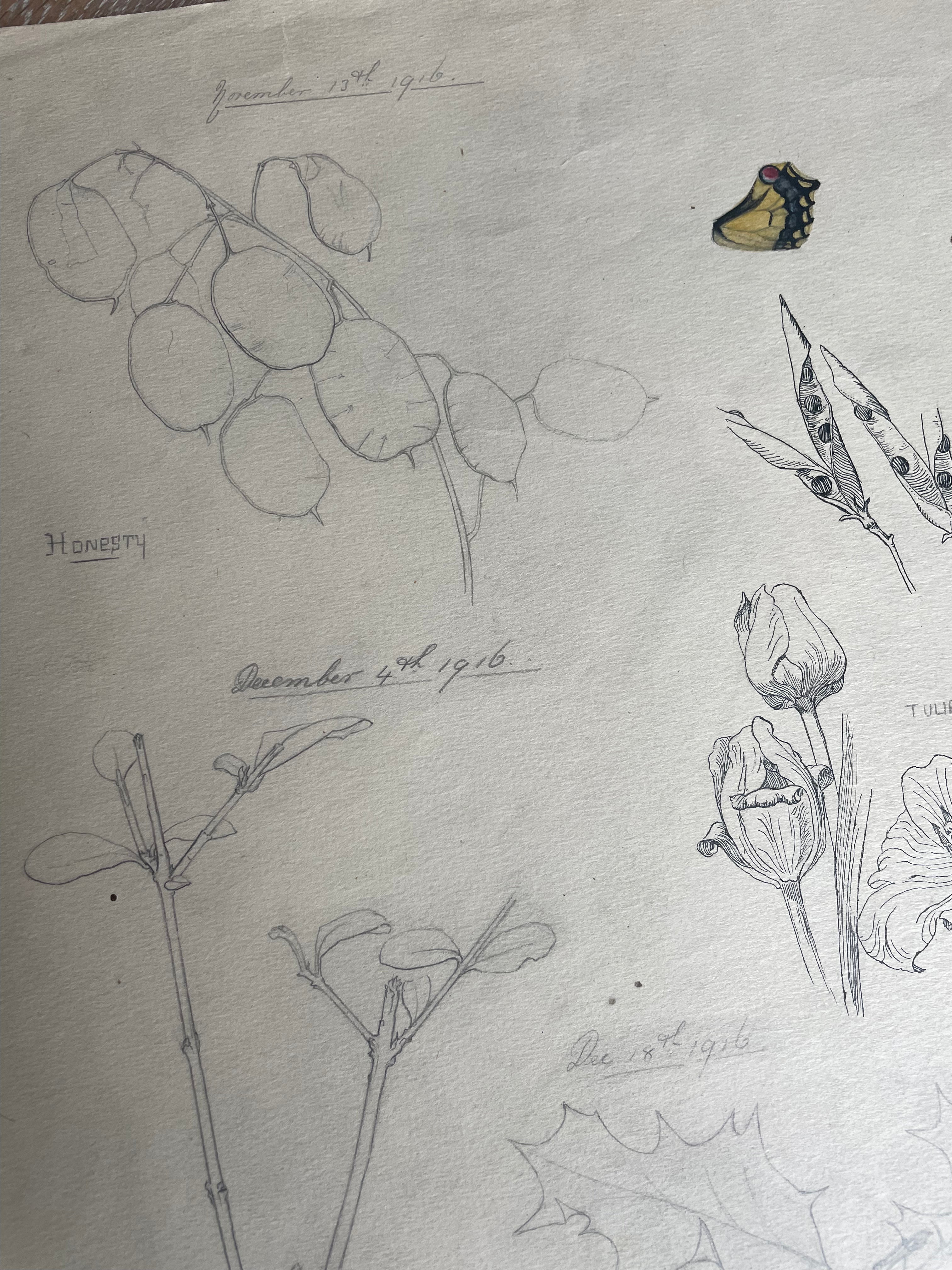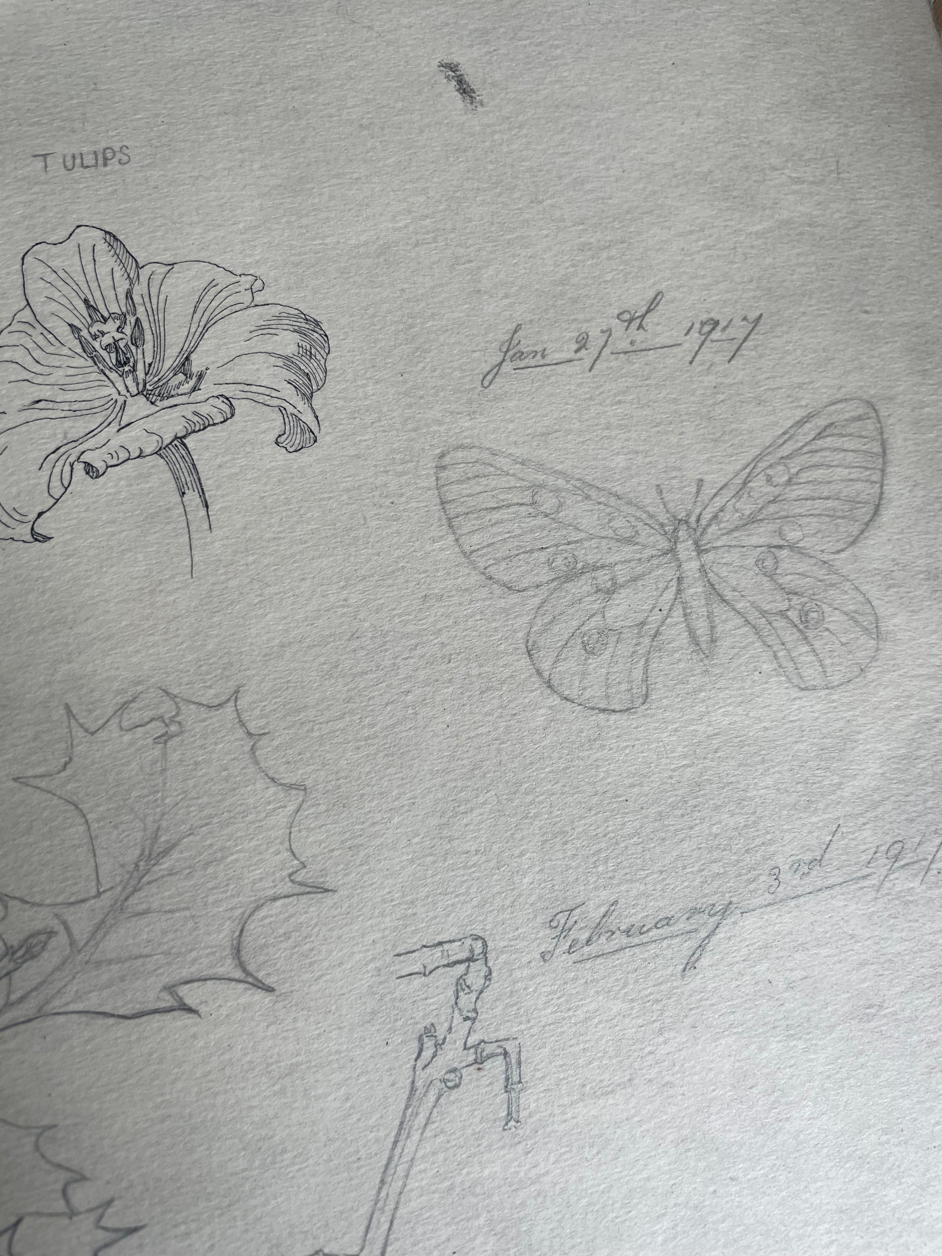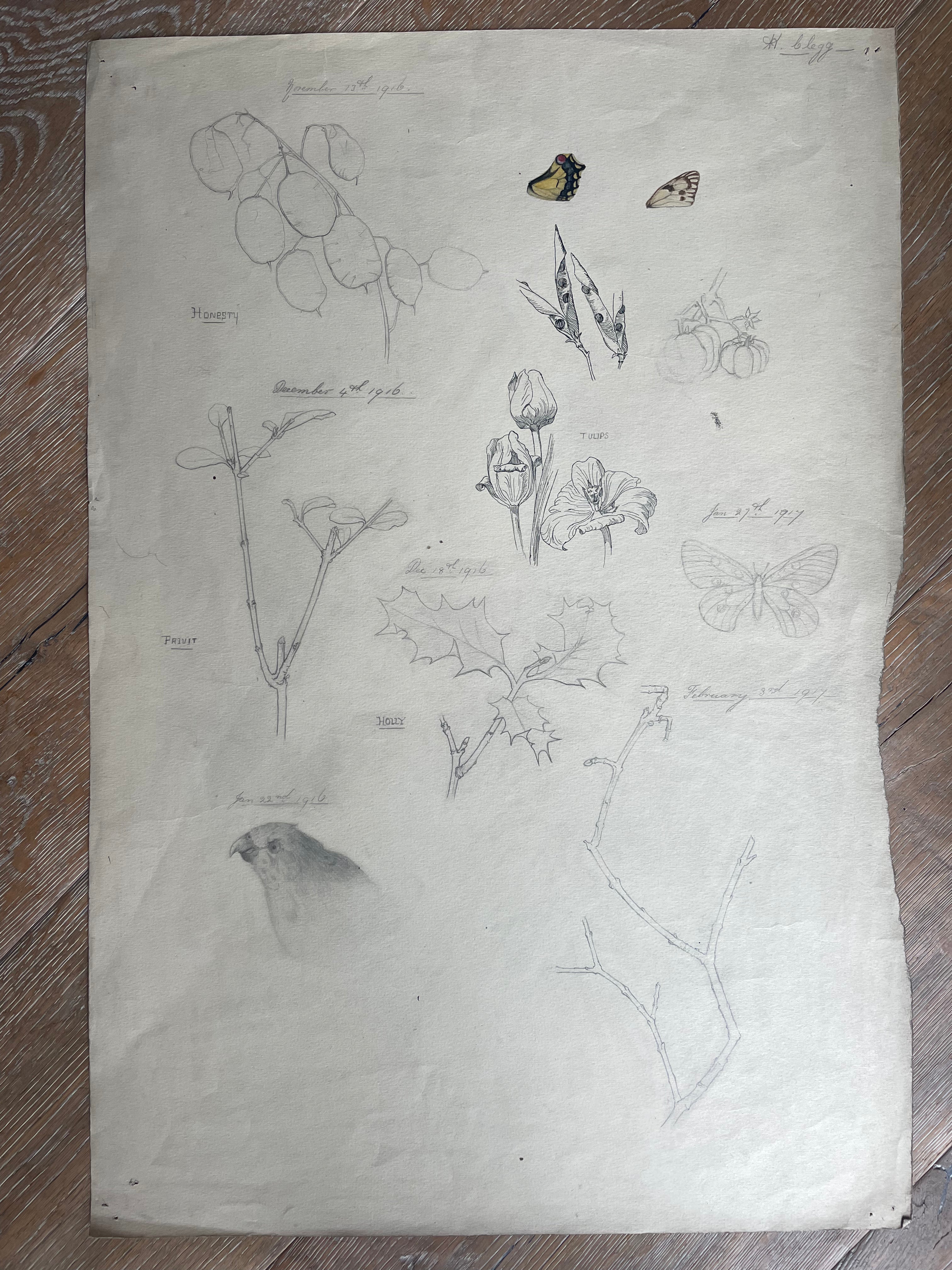 Beautiful pencil designs, some watercolour an pen on paper drawn over several months in December 1916 - February 1917.