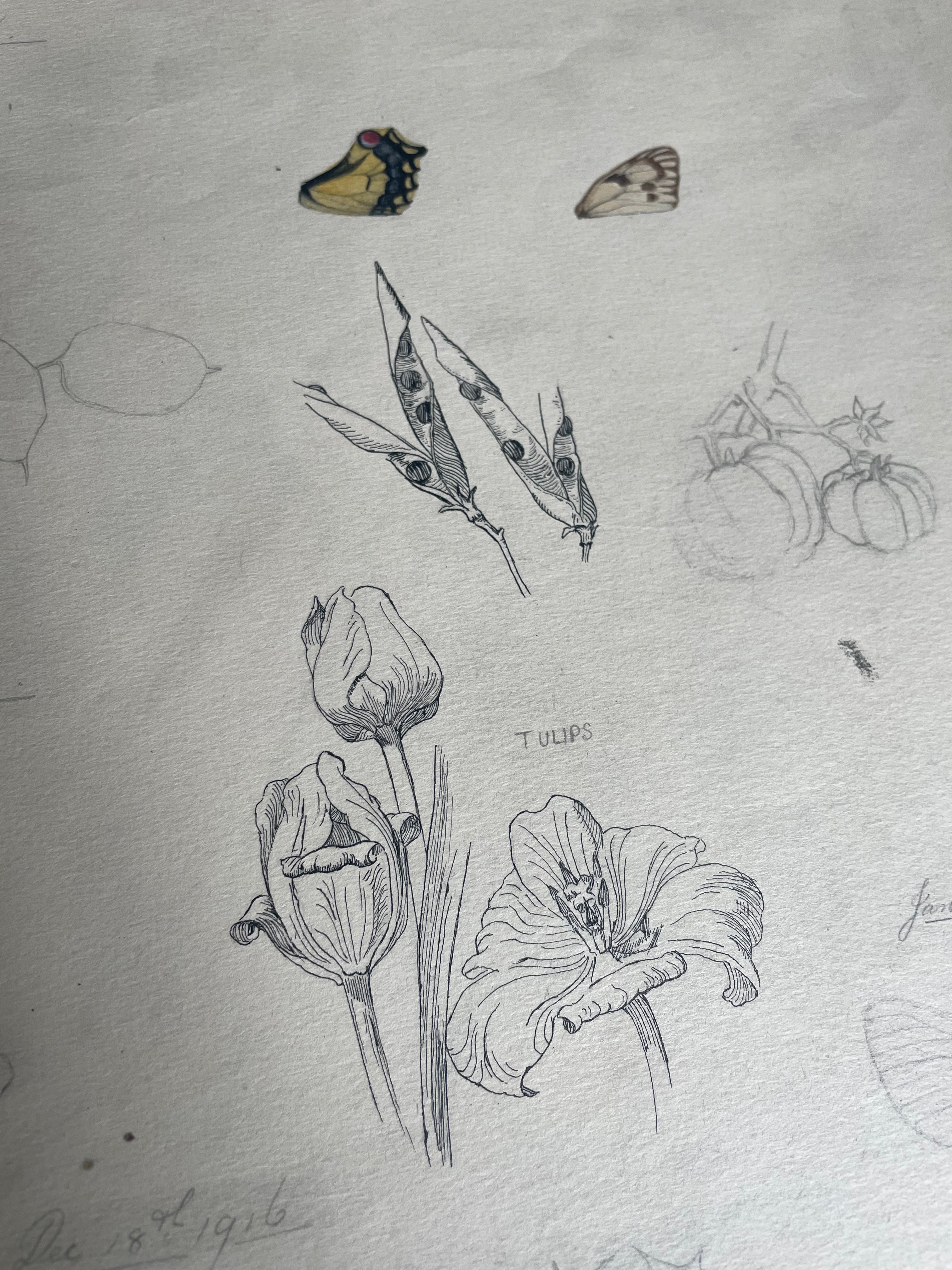 Pencil drawings by Hilda Clegg of fruit, flowers, butterflies and birds